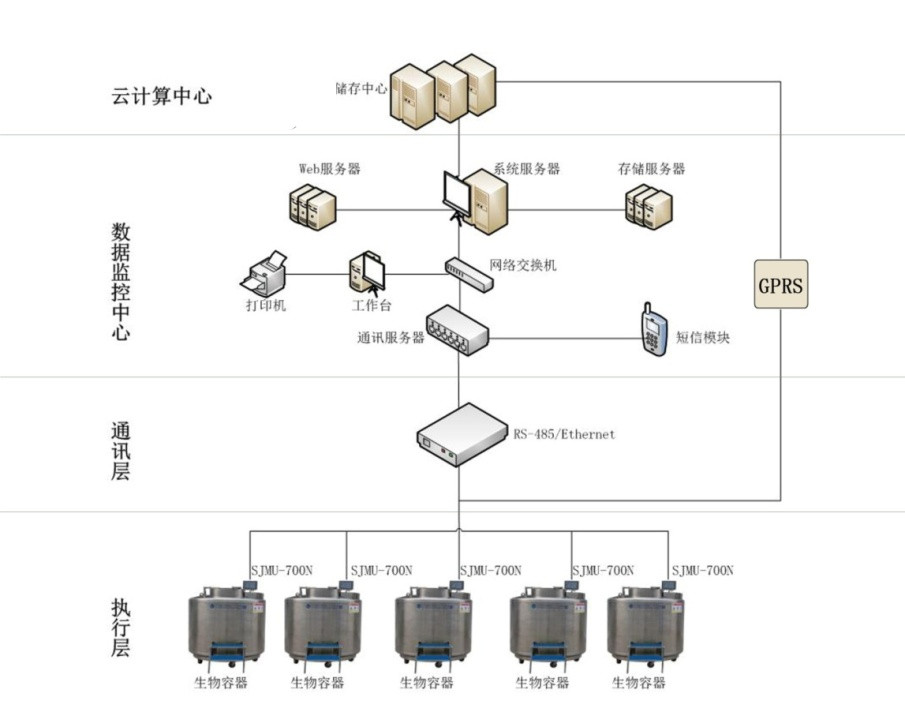 液氮罐監(jiān)控:實(shí)時(shí)采集低位、高位溫度,檢測液位高度;根據(jù)液位值和溫度值自動(dòng)開關(guān)進(jìn)液電磁閥;發(fā)送報(bào)警信息。